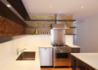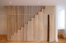 The owners of a four-story brownstone sought to create a new duplex for their growing family and design business. The duplex is organized with the entry, living room, kitchen, guest bath and flexible office/bedroom space at the ground floor and two new bedrooms with shared bath at the second floor. Connecting the two levels is a new stair clad in butcher block treads and risers with hickory slats that screen light cast from a large picture window. Below, the slats infill to create valuable storage space and integrate with a discrete yet light-filled desk to its side. The kitchen utilizes unique finishes, including custom laminated corian and plywood countertops and oriented strand board paneled backsplashes. Ikea panels are repurposed to create a series of wrap around open shelves with integrated LED lighting below. A new flexible space at the street side acts as a design/client meeting area for the business as well as a guest bedroom when needed. Upstairs, the new master and kids bedrooms feature large scale sliding pocket doors that can quickly transform the private spaces into a more open feeling loft for easy interaction. In between, a new grand shared bathroom contains custom wood framed medicine cabinets, a large trough sink, soaking tub and walk-in shower.